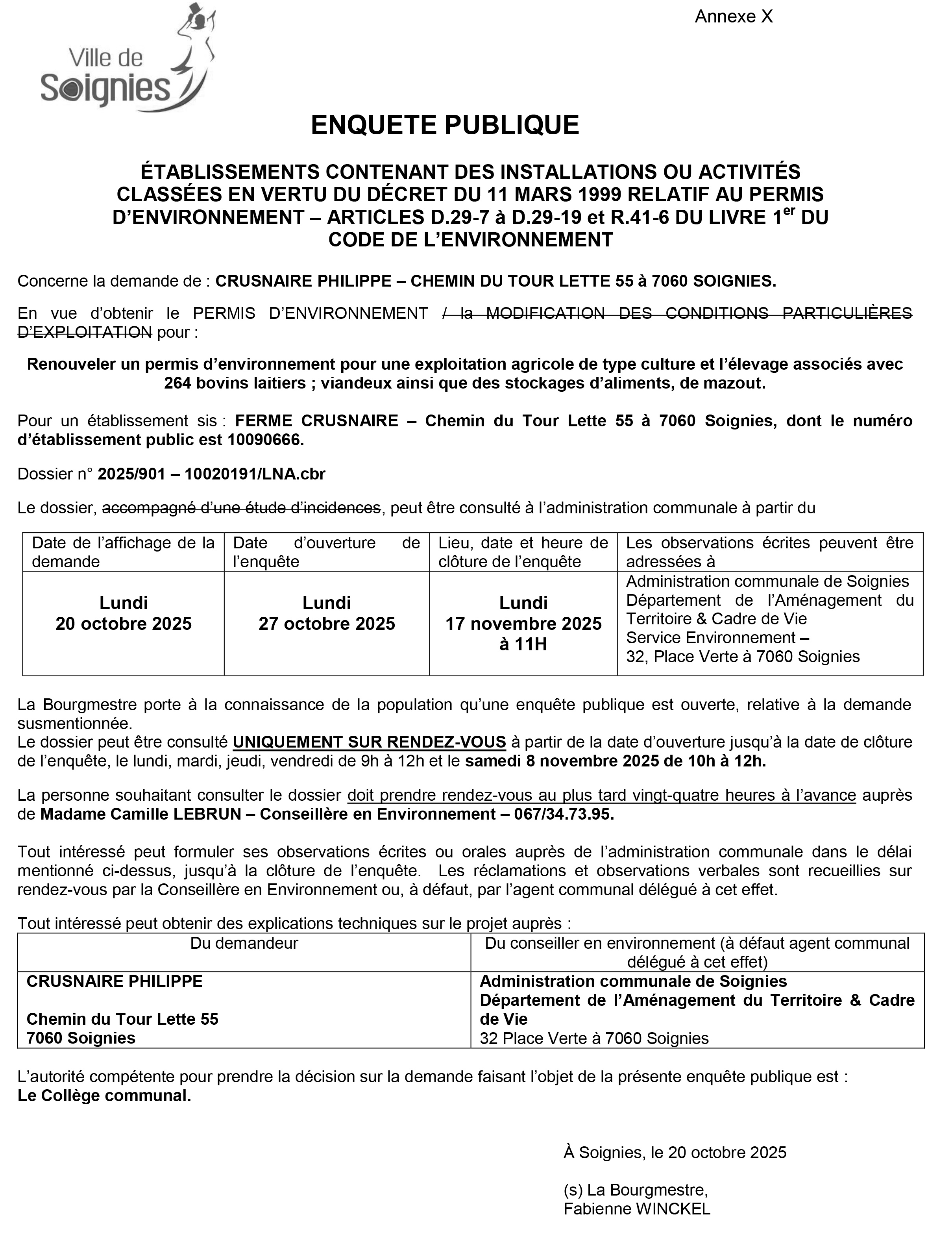 Enquête publique - Permis d'environnement exploitation agricole - Soignies