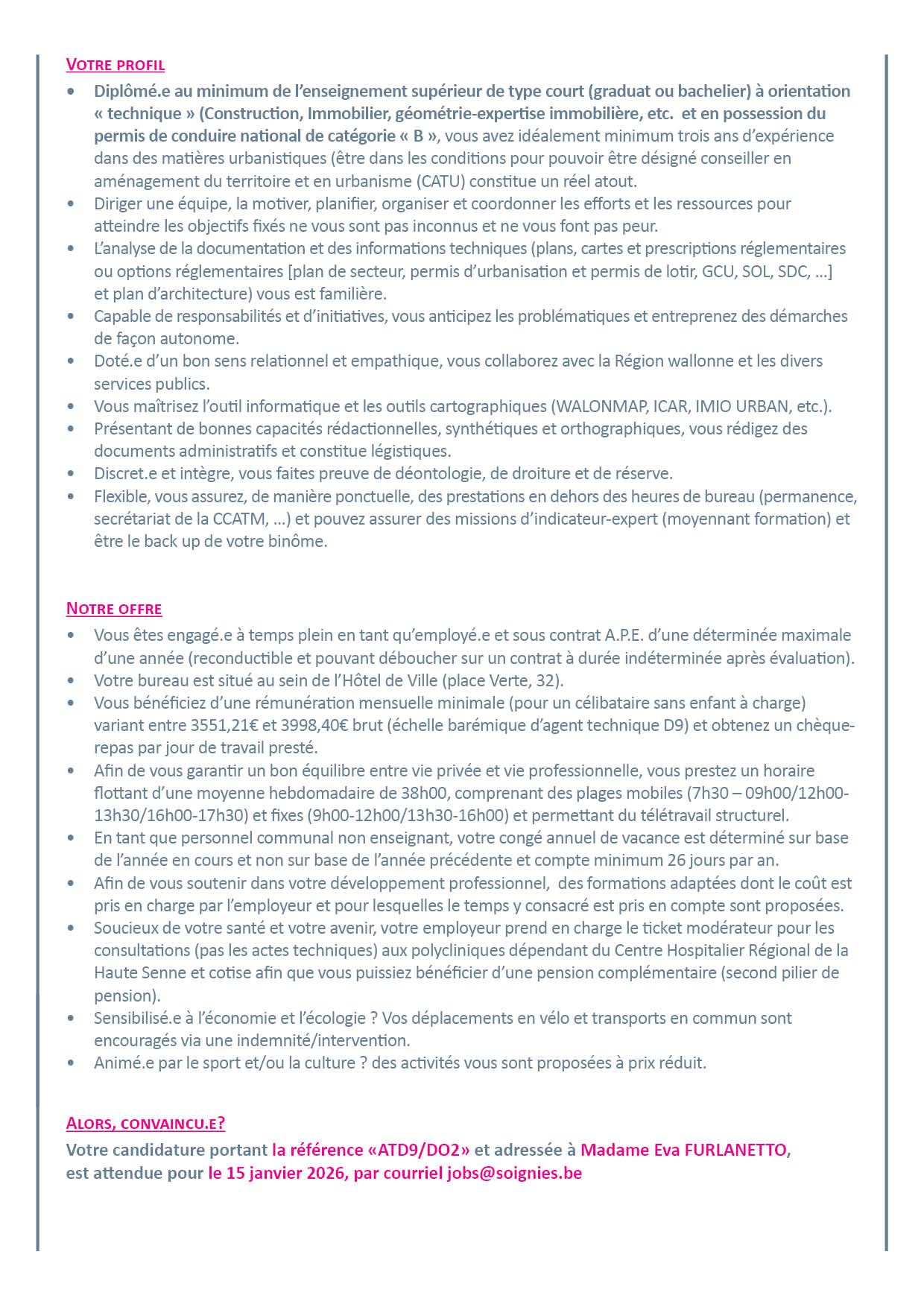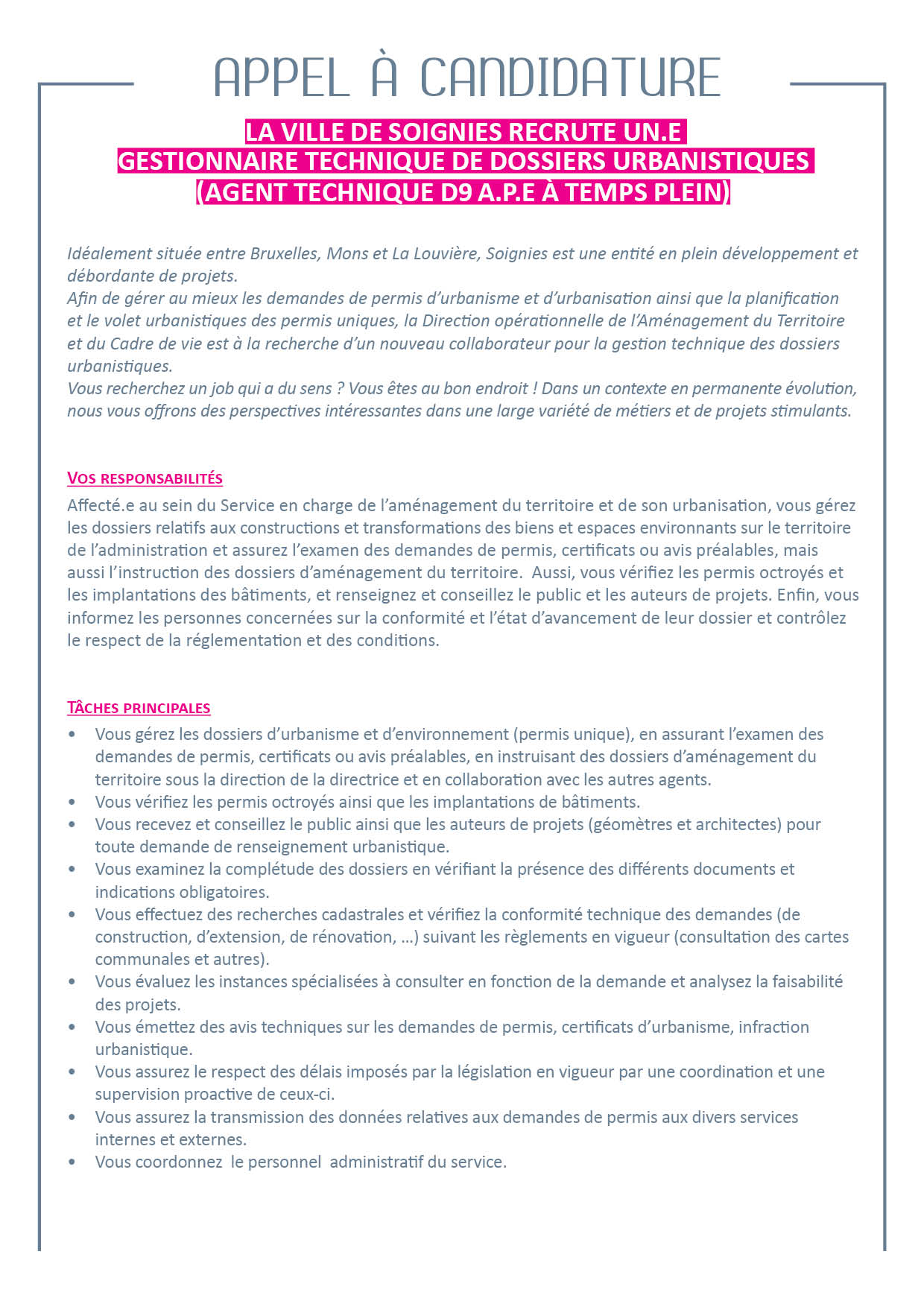 La Ville de Soignies recrute un.e gestionnaire technique de dossiers urbanistiques (agent technique D9 A.P.E à temps plein)