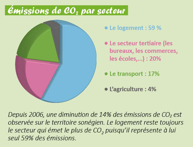 - À l’heure actuelle, le logement reste toujours le secteur qui émet le plus de CO2 puisqu’il représente à lui seul 59% des émissions. Même si cela représente une diminution de 12% par rapport à la situation de 2006, la sensibilisation des citoyen.ne.s à la rénovation du bâti sonégien reste primordiale.