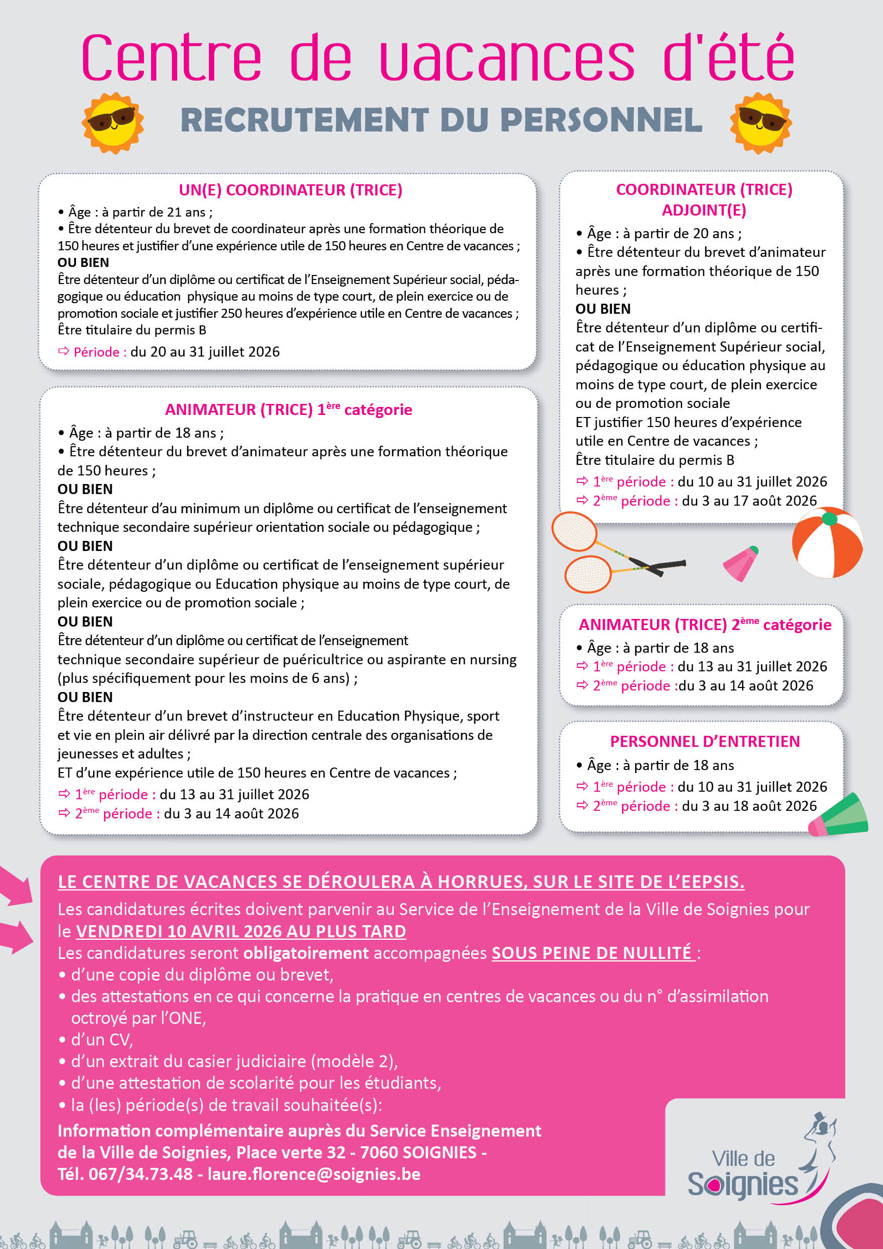 Pour son Centre de vacances d’été qui se déroulera du 13 juillet au 14 août sur le site de l’E.E.P.S.I.S. à Horrues, la Ville de Soignies recrute :
