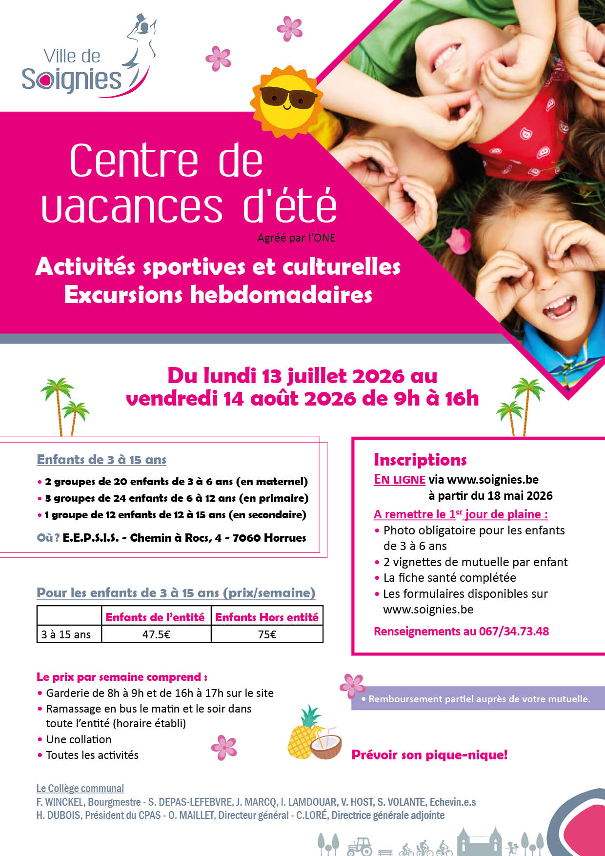 Cette année, la plaine de jeux d’été de la Ville de Soignies se déroulera du lundi 13 juillet 2026 au vendredi 14 août 2026 inclus.