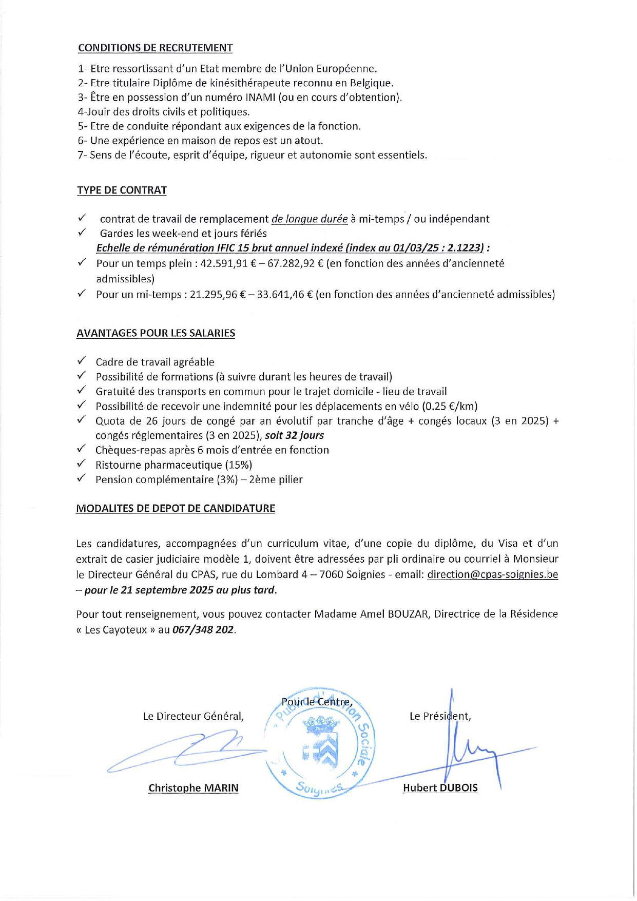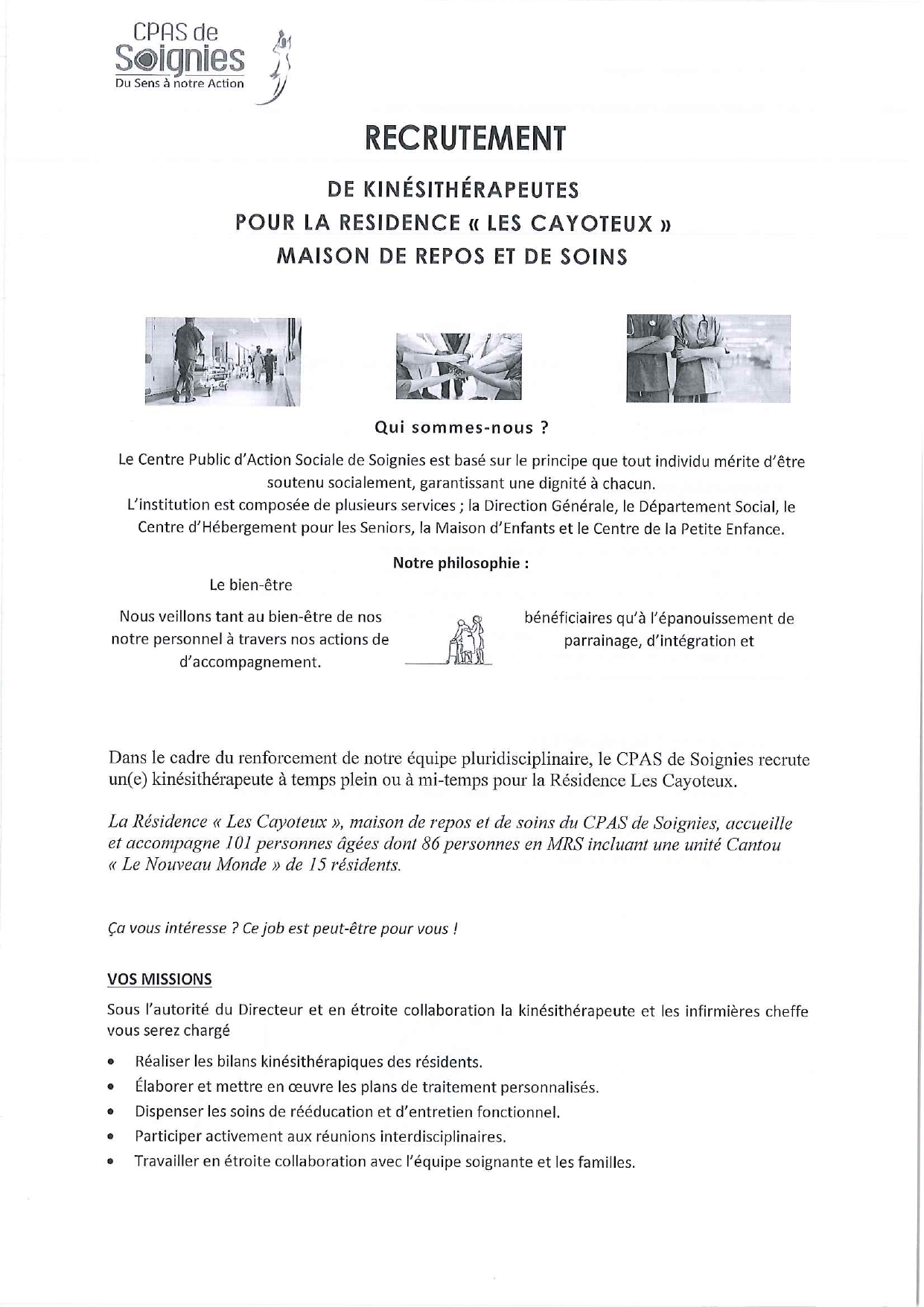 Le CPAS recrute un.e kinésithérapeute pour la résidence "Les Cayoteux"